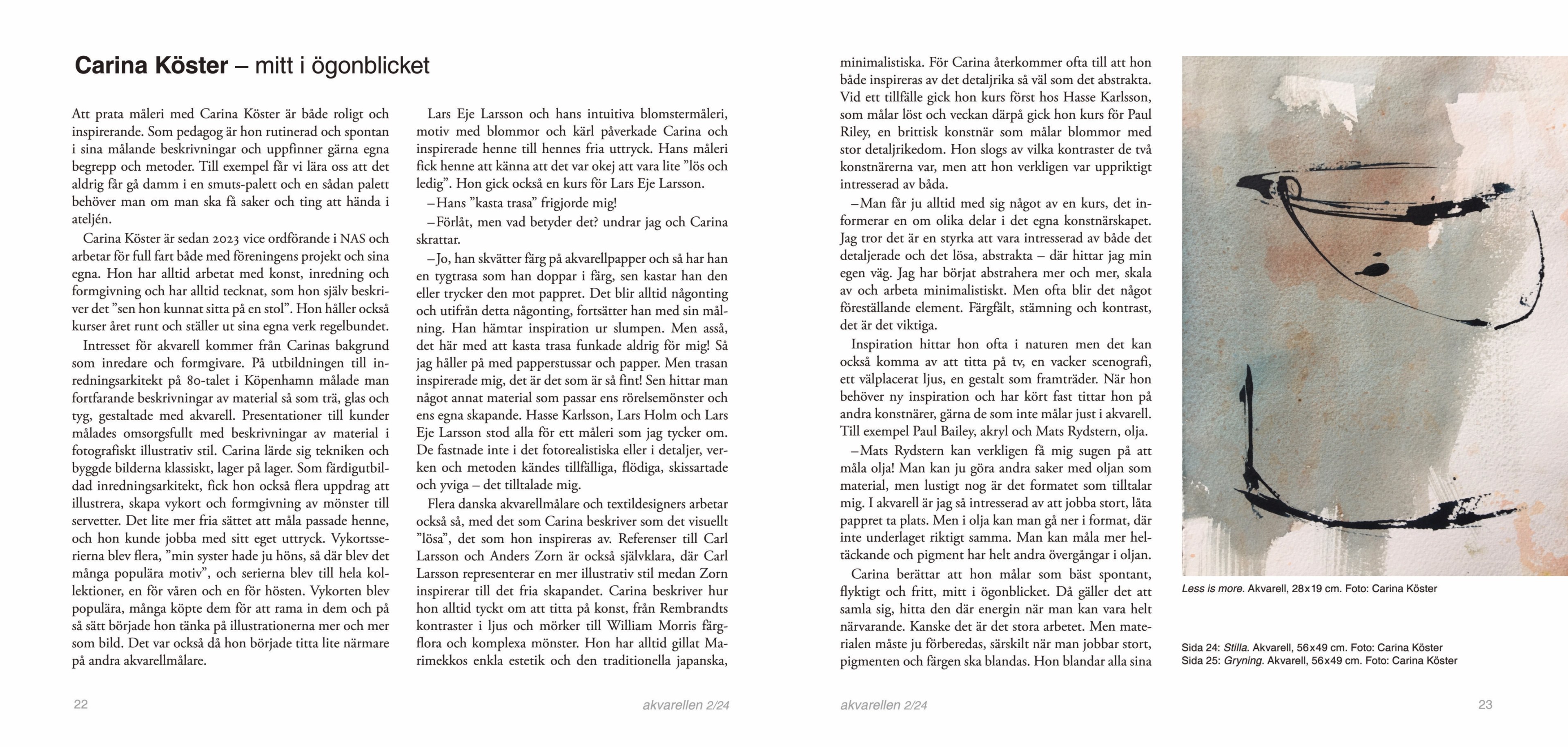 Artikel om konstnären Carina Köster i magasinet “Akvarellen” n°2 — 2024