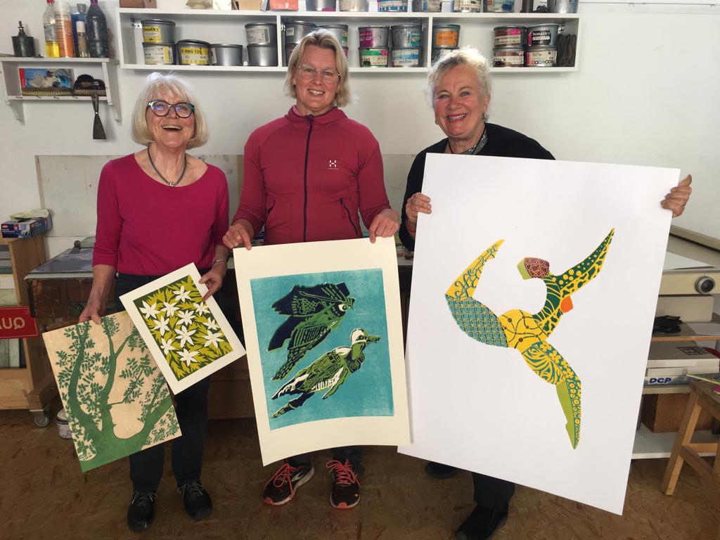 Träsnitt är en spännande och omväxlande teknik, man kan experimentera och variera, resultatet blir alltid en positiv överraskning. Anna och Thomas, våra workshopledare, välkomnar Sweor även till sina reguljära workshops.